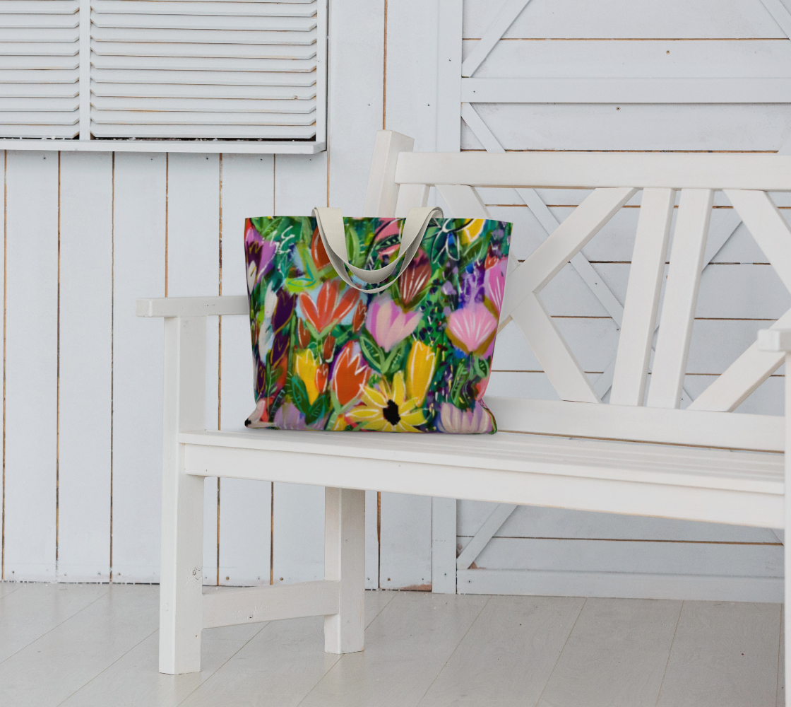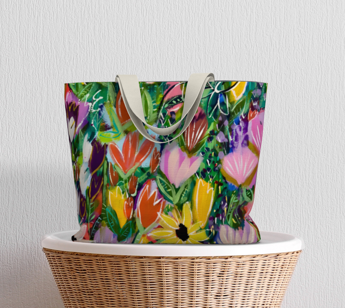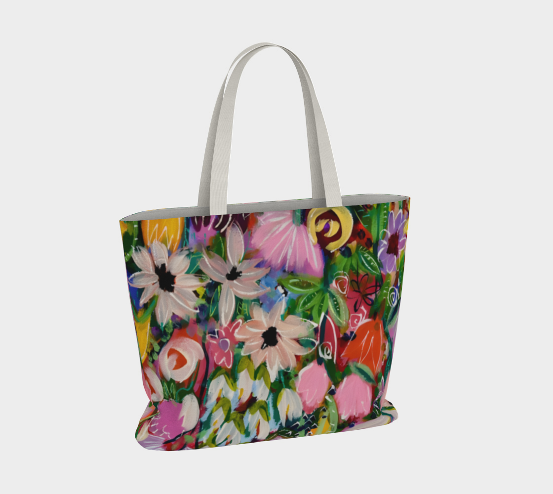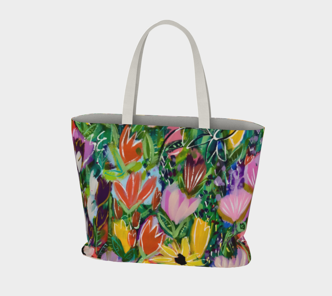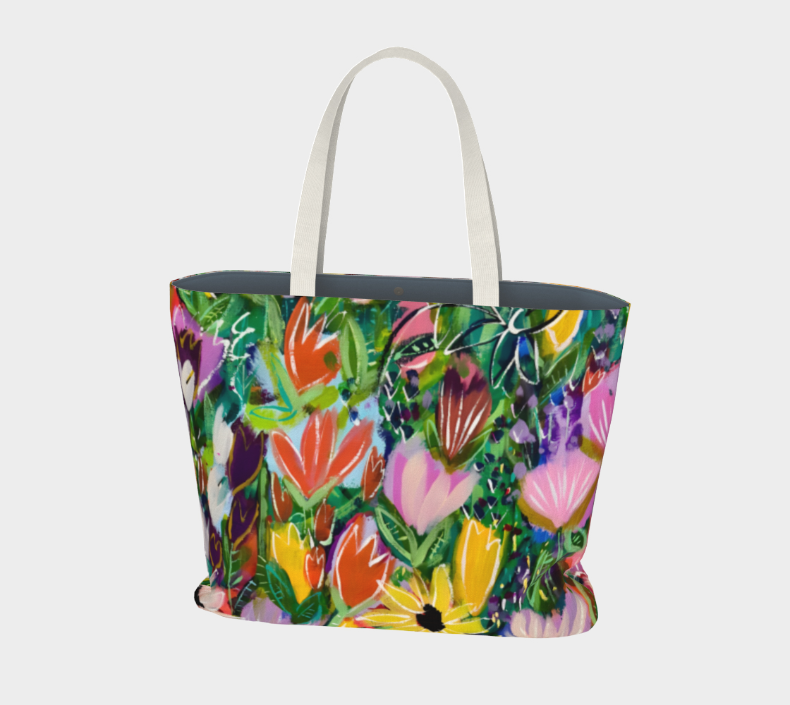 This oversized cotton canvas beauty blends functionality with serious style. Featuring our original, one-of-a-kind artwork, this tote isn’t just a bag — it’s a walking piece of joy. Whether you're hauling groceries, notebooks, or a fresh bouquet, it adds a burst of color (and creativity) wherever you go!